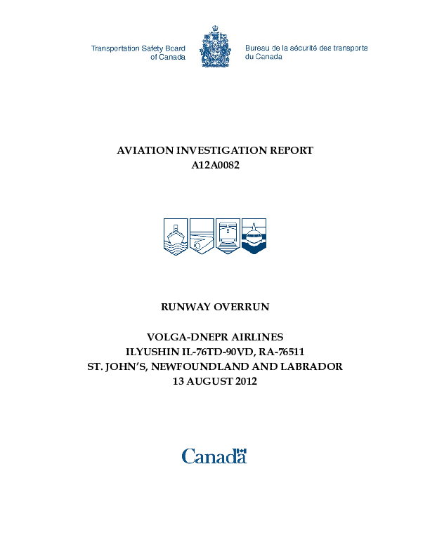 Aviation Accident Report A12A0082, IL76 runway excursion, St Johns Newfoundland, Canada, 13 Aug 2012