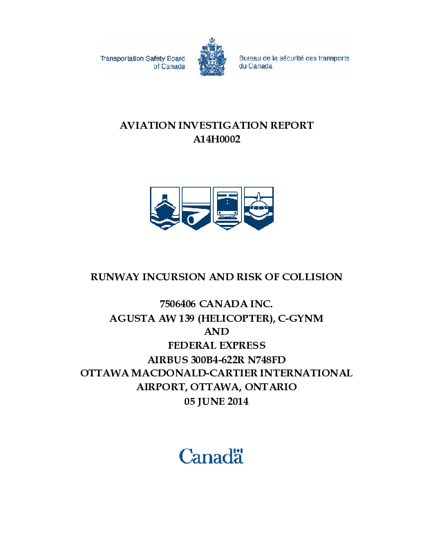 Aviation Investigation Report A14H0002 Runway Incursion Risk of Collision A139-A30B Canada 2014