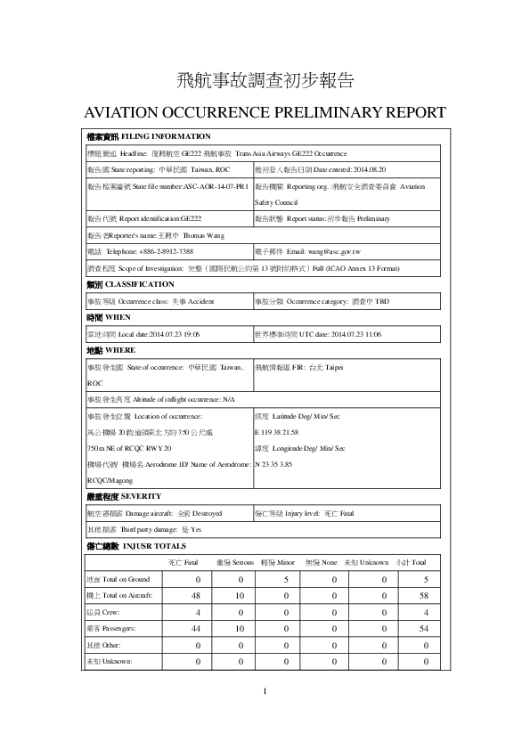Aviation Occurrence Preliminary Report, AT76 loss of control, Pengdu Island, Taiwan, 23 July 2014