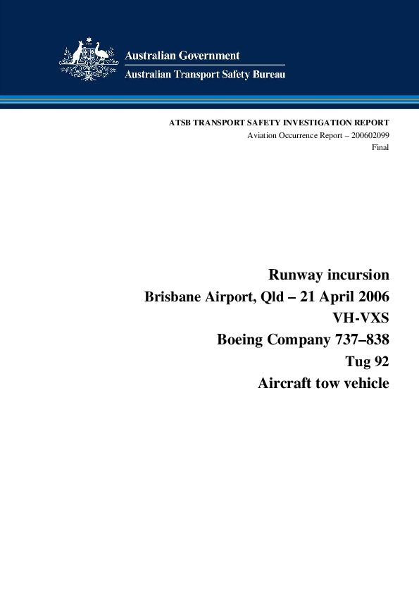 Aviation Occurrence Report – 200602099, Runway incursion B738 and tow vechicle, Brisbane Australia,