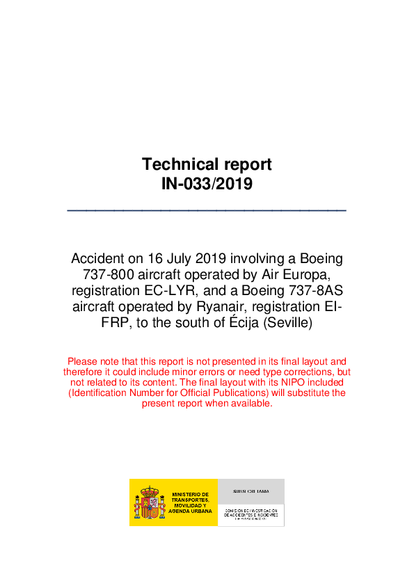 On 16 July 2019, a Boeing 737-800 inbound to Malaga and another Boeing 738-800 inbound to Seville and under area radar control lost separation after the Malaga-bound aircraft was unexpectedly given radar headings to extend its destination track miles after early handover to a control sector which it had not yet entered. With no time to achieve resolution, the two aircraft, both descending, came within 1.3 nm of each other at the same level. The Investigation attributed the conflict to an overly-permissive Letter of Agreement between Seville Centre and Malaga Approach and recommended that it be revised to improve risk management.