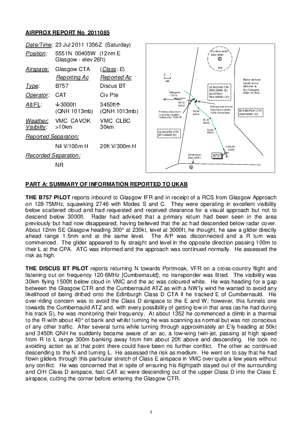 B752/GLIDER, LOS vicinity EGPF, 23 JUL 2011