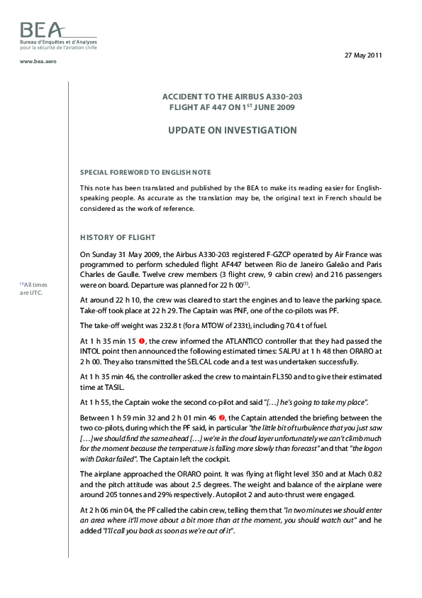 BEA = Update on Investigation, A330 South Atlantic 1 Jun 09, published 27 May 2011.
