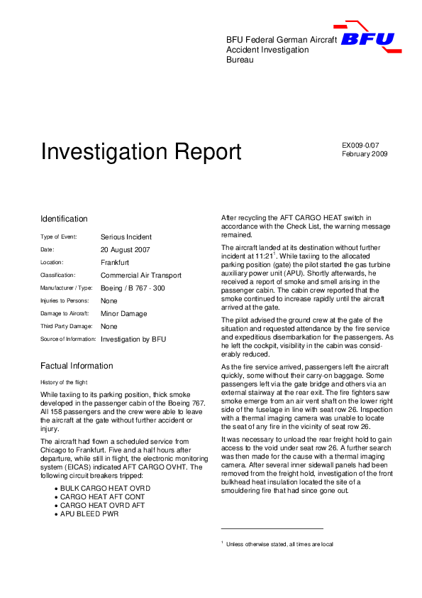 On 20 August 2007, at Frankfurt Airport, Germany, while Boeing 767-300 was taxiing to its parking position, a thick smoke developed in the passenger cabin. All passengers and the crew were able to leave the aircraft at the gate without further incident.