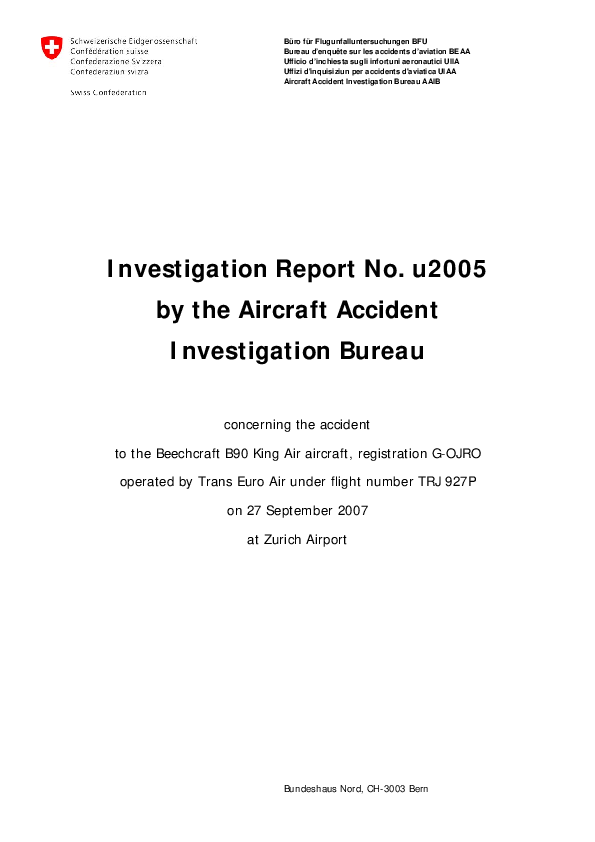 BFU - Investigation Report No. u2005, BE9L Runway Excursion, Zurich Switzerland, 27 Sept 2007