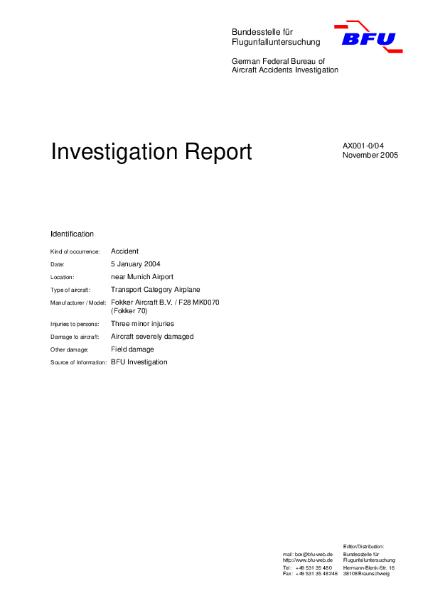 BFU - Report AX001-0/04 Nov 2005: F70 icing event