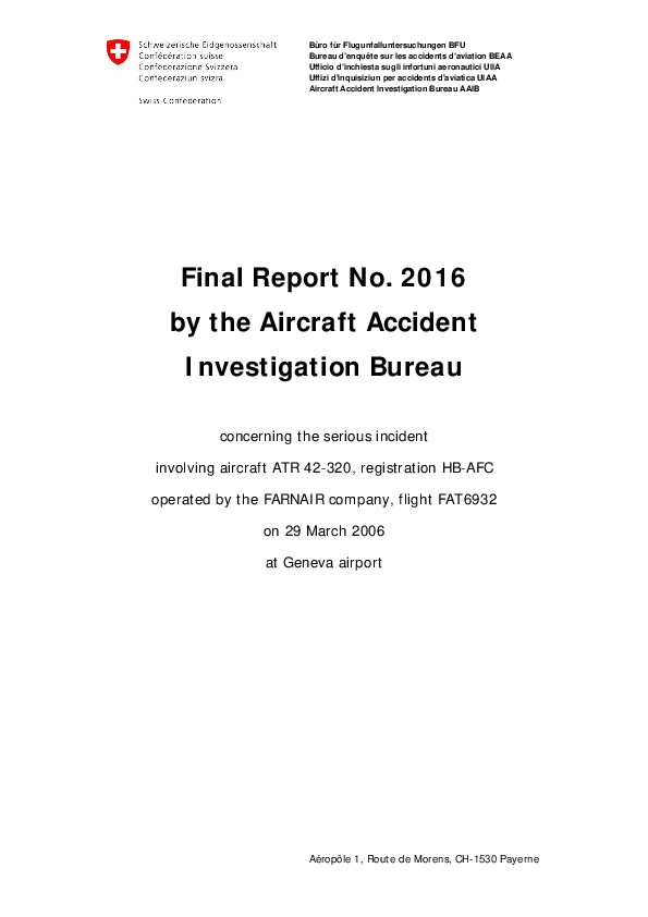 BFU - Report No. 2016 serious incident involving aircraft ATR 42-320, Geneva airport, 29 March 2006