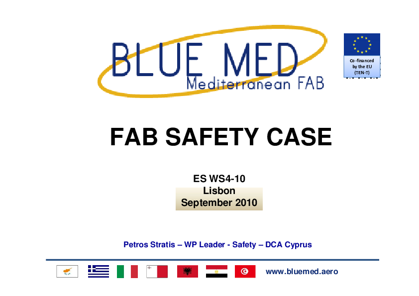 Blue med is a regional ATM development project aiming towards the creation of a FAB in the Mediterranean area, comprising four EU states: Cyprus, Greece, Italy, Malta. This presentation is an overview on the safety case phases at Blue Med.