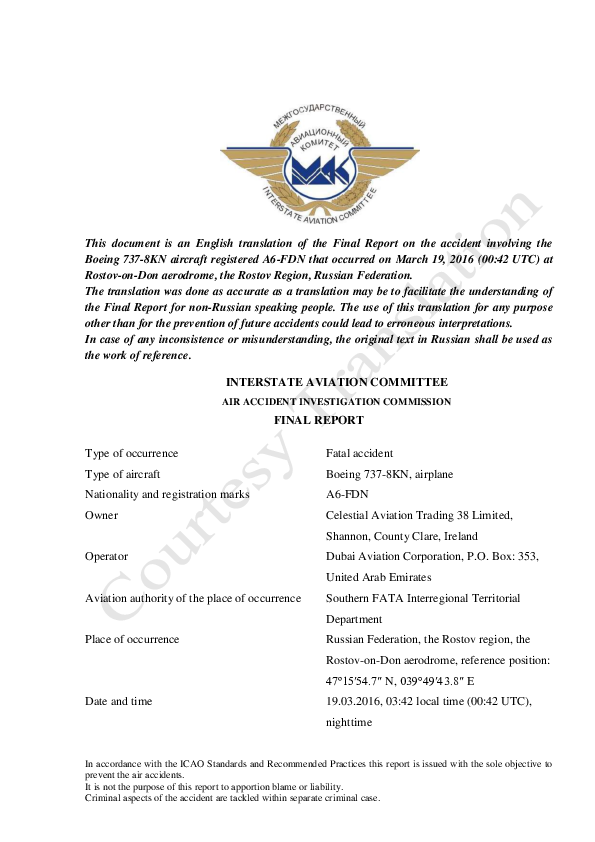 This document is an English translation of the Final Report on the accident involving the Boeing 737-8KN aircraft registered A6-FDN that occurred on March 19, 2016 (00:42 UTC) at Rostov-on-Don aerodrome, the Rostov Region, Russian Federation.