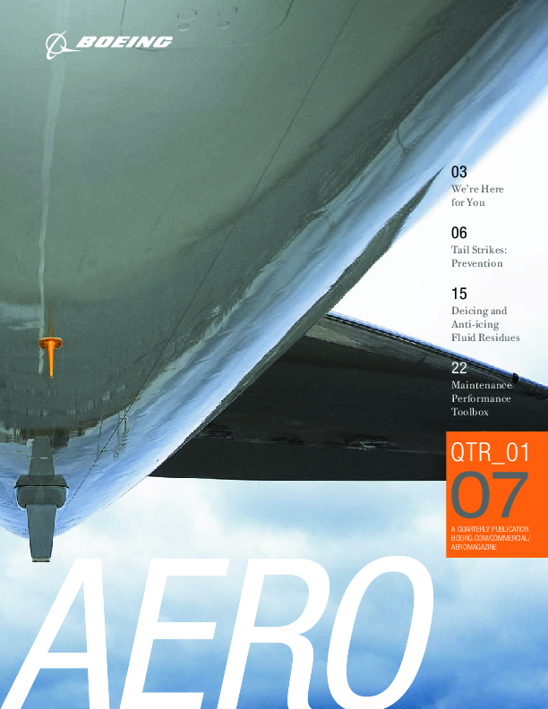 Content We’re Here for You — 24/7/365 The Operations Center works around the clock to answer urgent in-service requests. Tail Strikes: Prevention Environmental factors, such as gusty winds and strong crosswinds, can often be overcome by a well‑trained and knowledgeable flight crew following prescribed procedures. Deicing and Anti-icing Fluid Residues To help keep airplanes safe in winter, operators should inspect and remove deicing/anti-icing fluid residues in hidden places in the wings and stabilizers. Maintenance Performance Toolbox With graphical interfaces and advanced data-mining techniques and search capabilities, the Toolbox reduces the time needed to access and use maintenance information