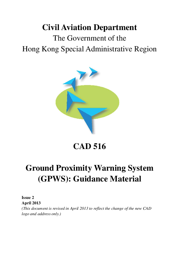 The purpose of this publication is to provide to all concerned in the operation of aeroplanes information on, and guidance in the use of, ground proximity warning systems (GPWS). Legislation regarding the requirement to carry GPWS is to be found in the Air Navigation (Hong Kong) Order 1995. In compliance with ICAO Standards, Airworthiness Directives are issued from time to time which amplify the Order and set out amendments to regulatory requirements as equipment performance advances and as changes in aviation safety-related needs are identified. This document includes information on the different categories of alerts or warnings which may be encountered in flight, together with advice concerning the appropriate flight crew response to each case. The various modes of protection afforded by the equipment are described. However, details of the operating envelopes of the systems are set out in manufacturers’ handbooks or company Operations Manuals which should be studied by all personnel involved in the operation of aeroplanes equipped with GPWS. Information is also presented recommending the details which should be included in Checklists, Operations and Training Manuals.