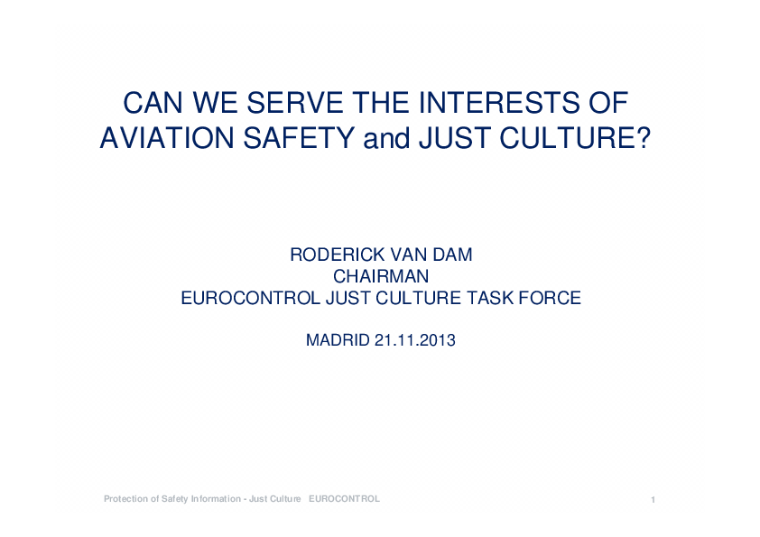 This presentation deals with safety data and its protection, with the interaction between safety and judiciary domains, Just Culture task force and model for a national aviation prosecution policy.