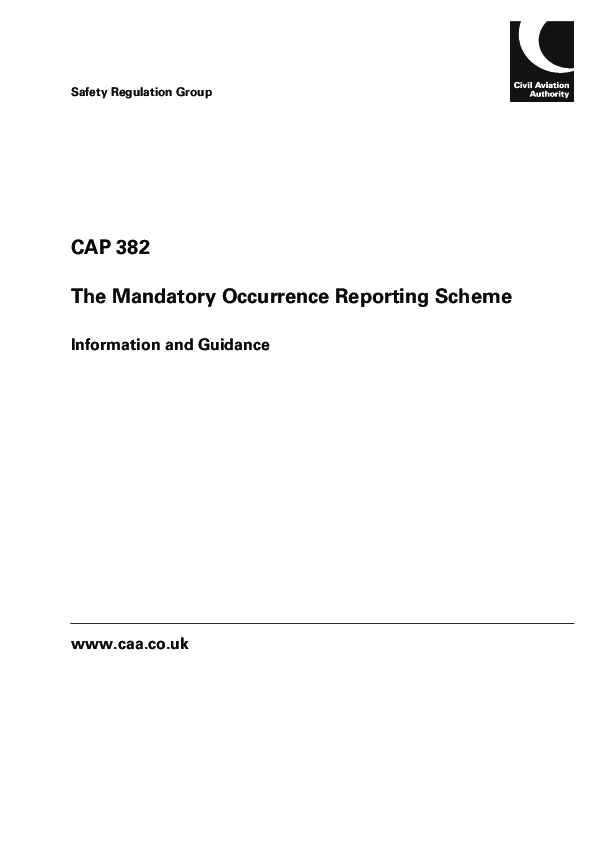 The purpose of this publication is to describe the CAA Mandatory Occurrence Reporting (MOR) Scheme and to provide guidance to those who, by the associated legislation, are involved in its operation. CAP 382 has been amended to incorporate the requirements of Article 142 of the ANO 2005. This Article is the incorporation of the requirements of EC Directive 2003/42/EC of 13 June 2003 on occurrence reporting in civil aviation into UK law.
