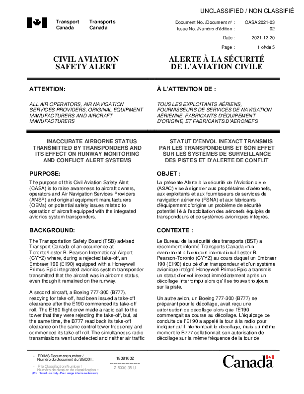 CASA-2021-03 : Inaccurate Airborne Status Transmitted by Transponders and its Effect on Runway Monitoring and Conflict Alert Systems