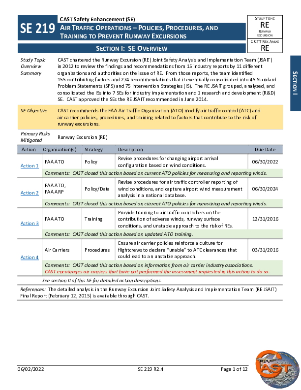 CAST SE 219 R2.4 Runway Excursion, Air Traffic Operations, Policies, Procedures and Training to Prevent Runway Excursion