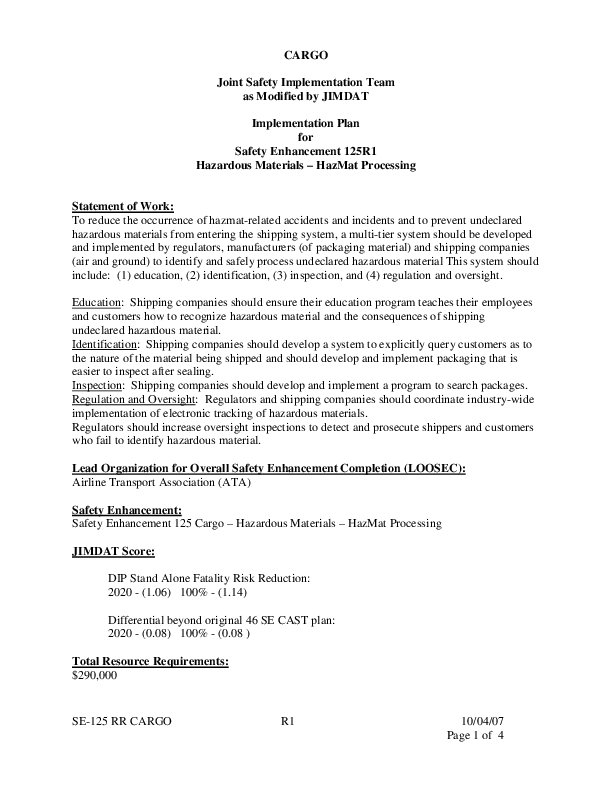 Detailed Implementation Plan for Safety Enhancement 125 Cargo - Hazardous Materials HazMat Processing
