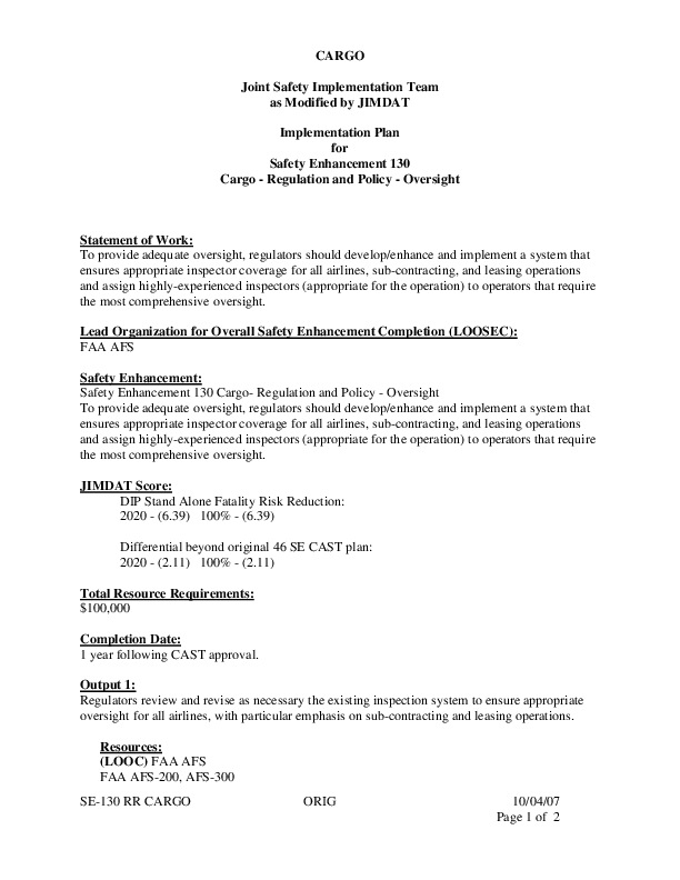 CAST - SE130 DIP Cargo Safety Enhancement 130 Cargo, Regulation and Policy, Oversight