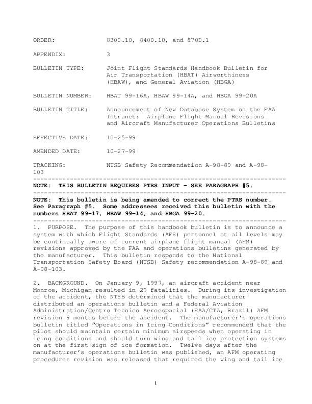Handbook Bulletin for Air Transportation Announcement of New Database System on the FAA Intranet: Airplane Flight Manual Revisions and Aircraft Manufacturer Operations Bulletins