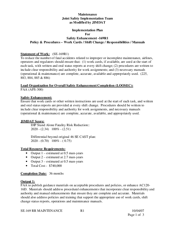 Detailed Implementation Plan for Safety Enhancement 169 Maintenance - Policies and Procedures Safety Enhancement -169R1 Policy & Procedures †Work Cards / Shift Change / Responsibilities / Manuals