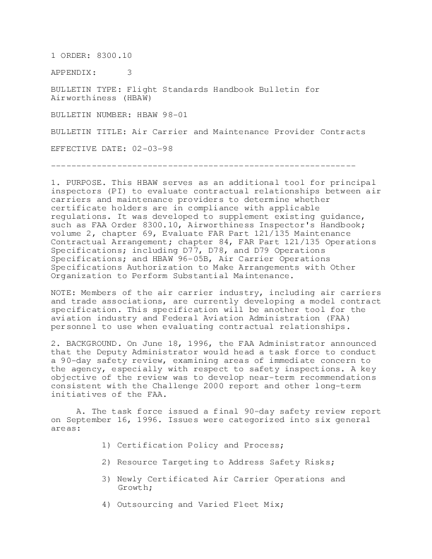 Handbook Bulletin for Airworthiness Aircraft and Maintenance Provider Contracts (HBAW 98-01)