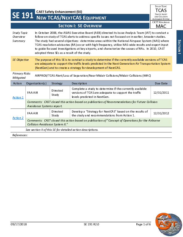 CAST - SE191R2.0 DIP New TCAS/NextCAS Equipment (TCAS Directed Study)