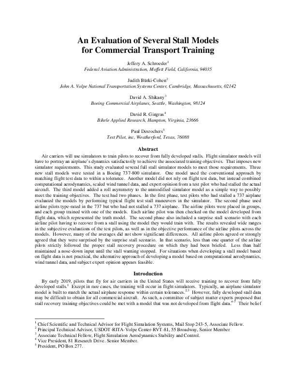 Research to evaluate simulator stall models Schroeder, Jeffery A., et al. An evaluation of several stall models for commercial transport training. AIAA Modeling and Simulation Technologies Conference. 2014.