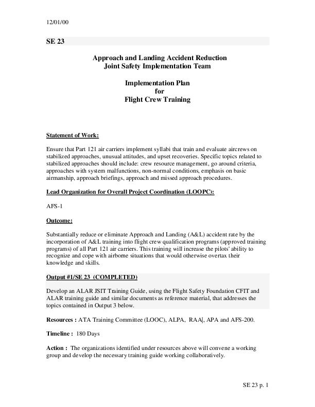 Detailed Implementation Plan for SE23: ALAR Flight Crew Training � One Project