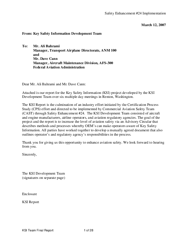 The KSI Report is the culmination of an industry effort initiated by the Certification Process Study (CPS) effort and directed to be implemented by Commercial Aviation Safety Team (CAST) through Safety Enhancement #24. The KSI Development Team consisted of aircraft and engine manufacturers, airline operators, and aviation regulatory agencies. The goal of the project and the report is to increase the level of aviation safety via an Advisory Circular that describes methods and processes whereby OEM�s can make operators aware of Key Safety Information. All parties have worked together to develop a mutually agreed document that also outlines operator�s and regulatory agency�s responsibilities in the process.