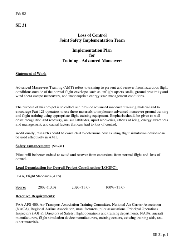 Detailed Implementation Plan for Safety Enhancement 31 - Loss of Control (LOC) Training Advanced Maneuvers Implement Ground and Flight Training (1-3)