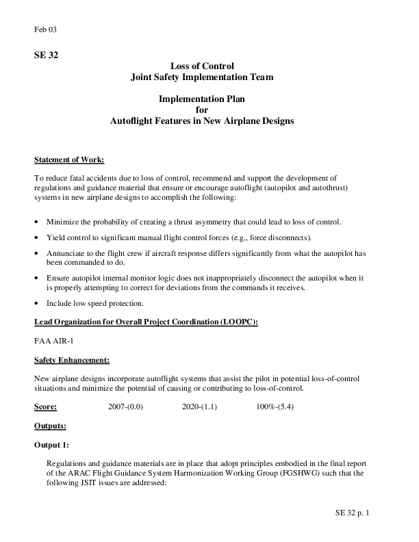 Detailed Implementation Plan for Safety Enhancement 32 - Loss of Control (LOC) Autoflight Design New Designs