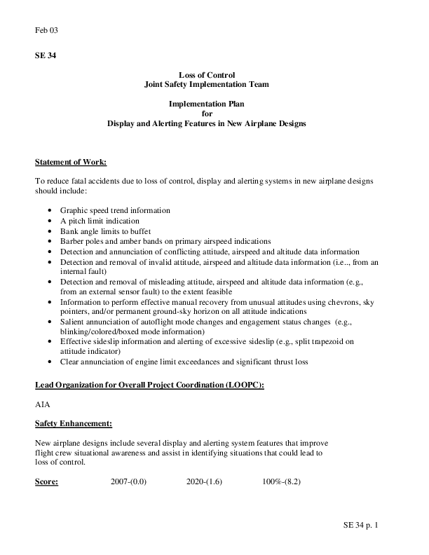 Detailed Implementation Plan for Safety Enhancement 34 - Loss of Control (LOC) Displays and Alerting Systems New designs (1-2) (Removed VSD)