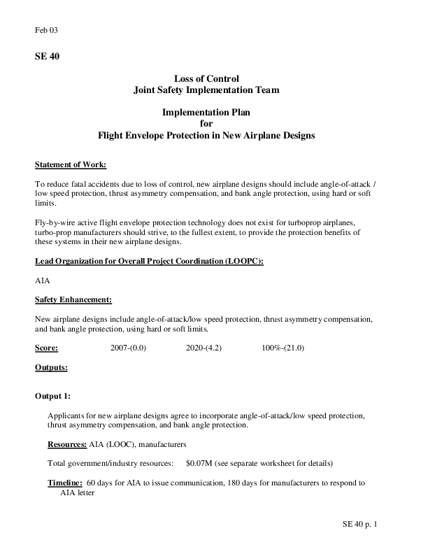 Detailed Implementation Plan for Safety Enhancement 40 - Loss of Control (LOC) Envelope Protection New Designs