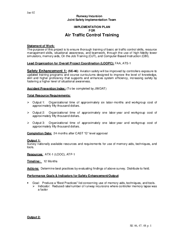 Detailed Implementation Plan for Safety Enhancement 46 - Runway Incursion Air Traffic Control Training Enhanced Tower Controller Training and Safety Enhancement 47 - RI Tower Controller CRM Training