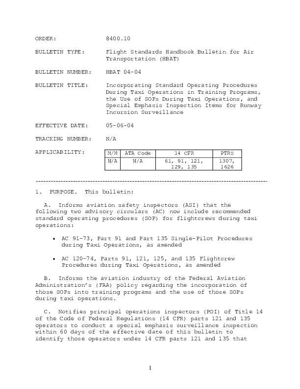 FAA Flight Standards Handbook Bulletin for Air Transportation (HBAT) 04-04, Incorporating Standard Operating Procedures During Taxi Operations in Training Programs, the Use of SOPs During Taxi Operations, and Special Emphasis Inspection Items for Runway Incursion Surveillance