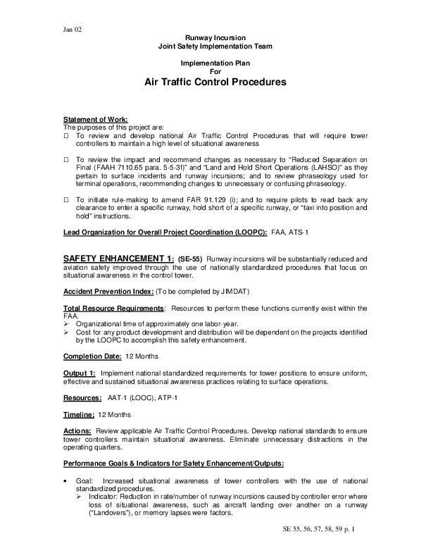 Detailed Implementation Plan for Safety Enhancements 55 through 59, various Runway Incursion SE's. Note that not all of the SE's in this DIP are on the CAST Plan.