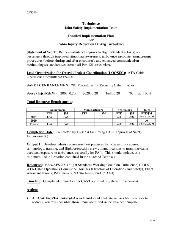 Detailed Implementation Plan for Safety Enhancement 78: Turbulence Procedures for Reducing Cabin Injuries