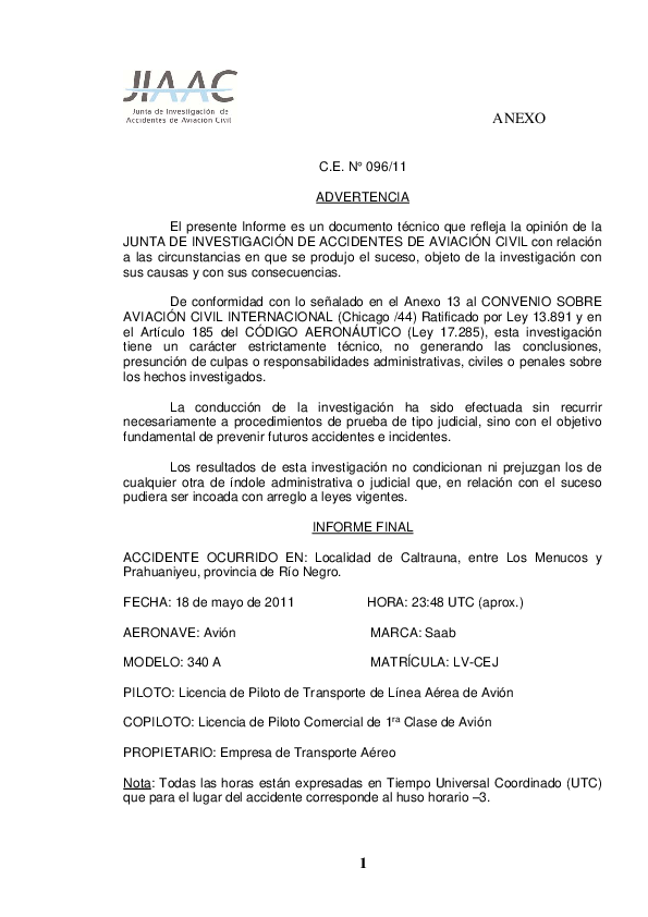 C.E. N° 096/11 Final Report (Spanish) SF34 near Caltrauna Argentina 2011