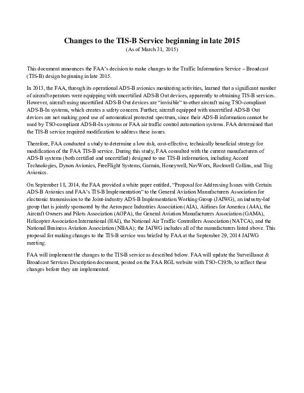 This document announces the FAA's decision to make changes to the Traffic Information Service Broadcast (TIS-B) design beginning in late 2015.