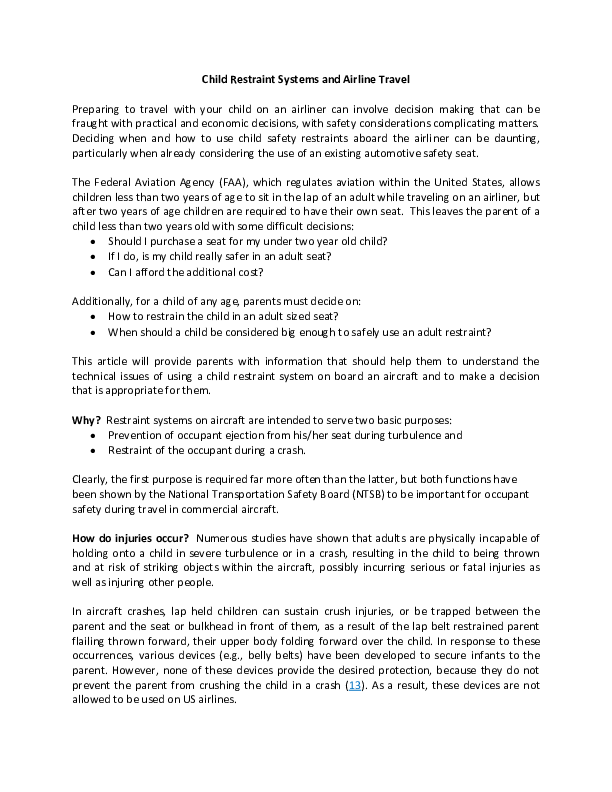 This article provides parents with information that should help them to understand the technical issues of using a child restraint system on board an aircraft and to make a decision that is appropriate for them.
