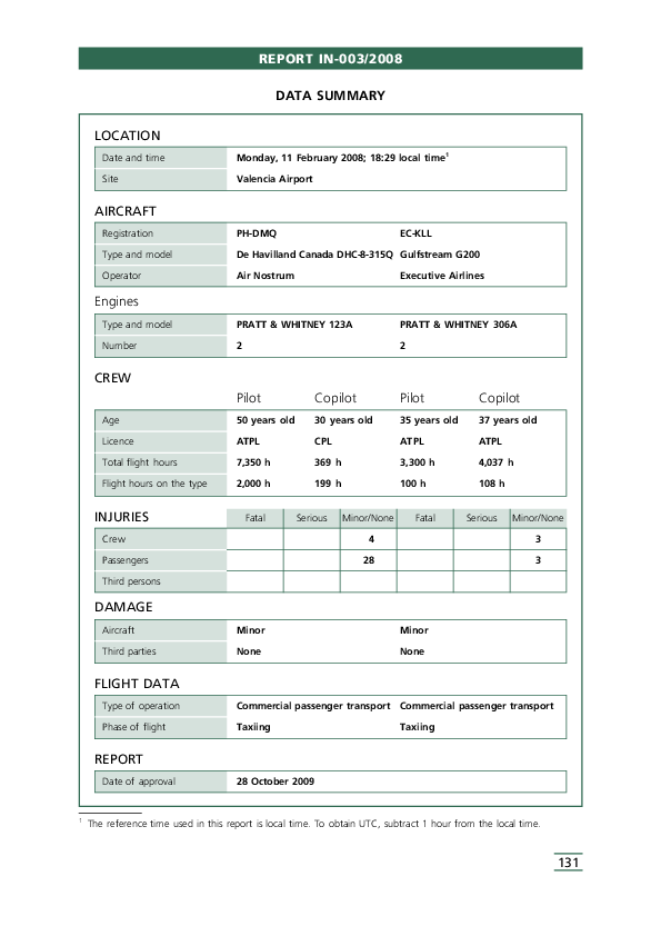 On 11 February 2008, a Gulfstream G200 being operated on a public transport passenger charter flight by Executive Airlines had landed on Runway 30 at Valencia and cleared the Runway to the right to taxi back on the parallel taxiway before stopping at a later intersection to wait for clearance to cross the same runway to the South Apron. The next aircraft to land, A DHC8-300 being operated by Air Nostrum on a scheduled passenger flight cleared Runway 30 further down and then also exited to the right and was cleared to taxi along it to the North Apron past the waiting Gulfstream. Although it was dark, the DHC8 crew believed that there would be sufficient clearance to safely pass the stopped aircraft but this turned out not to be the case and as a consequence of the ensuing slight collision, minor damage was caused to both aircraft.