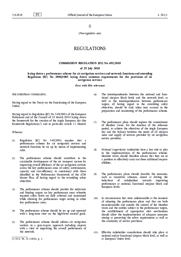 Cimmission Regulation (EU) No 691/2010 of 29 July 2010laying down a performance scheme for air navig