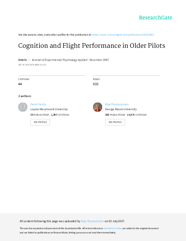The authors reviewed studies of cognitive proficiency and flight performance. Age-group differences were found in pilots in perceptual-motor skills and memory and, to a lesser extent, in attention and problem solving. Flight experience does not alter this age-related decline, with the possible exception of the metacognitive skill of time sharing. Age-group differences in flight performance are most evident in the secondary task of air traffic control communications. Age-related differences in current measures of pilot cognition are minimally predictive of primary measures of flight performance (flight simulation and accident rates). A model of cognition and flight performance is proposed involving higher order factors that tap into pilot knowledge structure, including mental workload and workload management, mental models, and situation awareness.