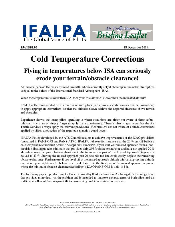 IFALPA Policy developed by the ATS Committee aims to achieve improvements of the ICAO provisions (contained in PANS-OPS and PANS-ATM). IFALPA believes for instance that the 20 % cut-off before a cold temperature correction needs to be applied is excessive. If you start your missed approach from a (non-precision final approach) minimum that provides only 246 ft obstacle clearance and have not applied 20 % altitude correction, your obstacle clearance in the intermediate part of the Missed Approach Segment is halved to 49 ft! Starting the missed approach just 20 seconds too late could easily deplete the remaining obstacle clearance. Furthermore, if you level off at the missed approach altitude without appropriate altitude correction, you might even be below the critical obstacle in the final part of the missed approach segment, where the minimum obstacle clearance according to ICAO PANS-OPS is only 164 ft.