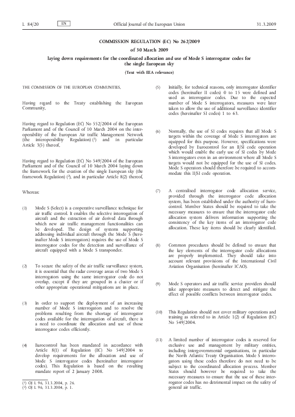 Comission Regulation (EC) No 262/2009 of 30 March 2009 laying down requirements for the coordinated