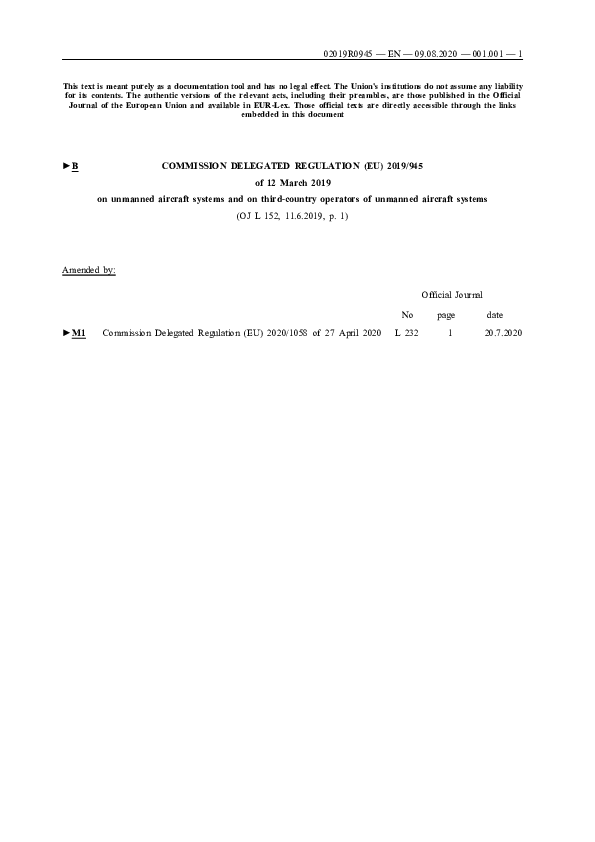 COMMISSION DELEGATED REGULATION (EU) 2019/945 of 12 March 2019 on unmanned aircraft systems and on t