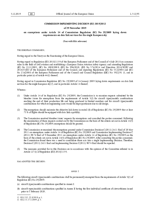 Commission Implementing Decision (EU) 2019/2012 - exemptions under Article 14 of Regulation No 29/20