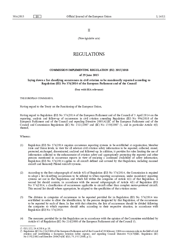 COMMISSION IMPLEMENTING REGULATION (EU) 2015/1018 of 29 June 2015 laying down a list classifying occurrences in civil aviation to be mandatorily reported according to Regulation (EU) No 376/2014 of the European Parliament and of the Council.