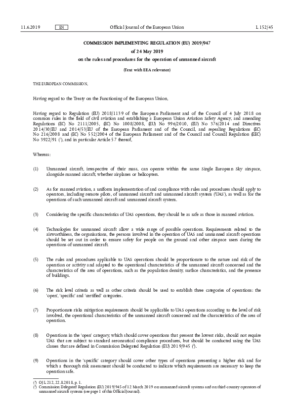 COMMISSION IMPLEMENTING REGULATION (EU) 2019/947 of 24 May 2019 on the rules and procedures for the