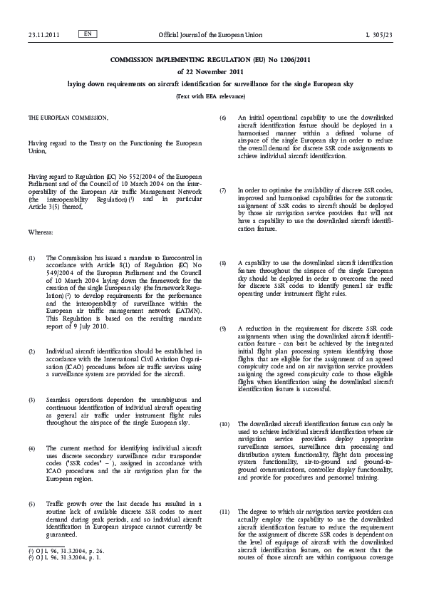 This Regulation lays down requirements for the systems contributing to the provision of surveillance information, their constituents and associated procedures in order to ensure the unambiguous and continuous individual identification of aircraft within the EATMN.