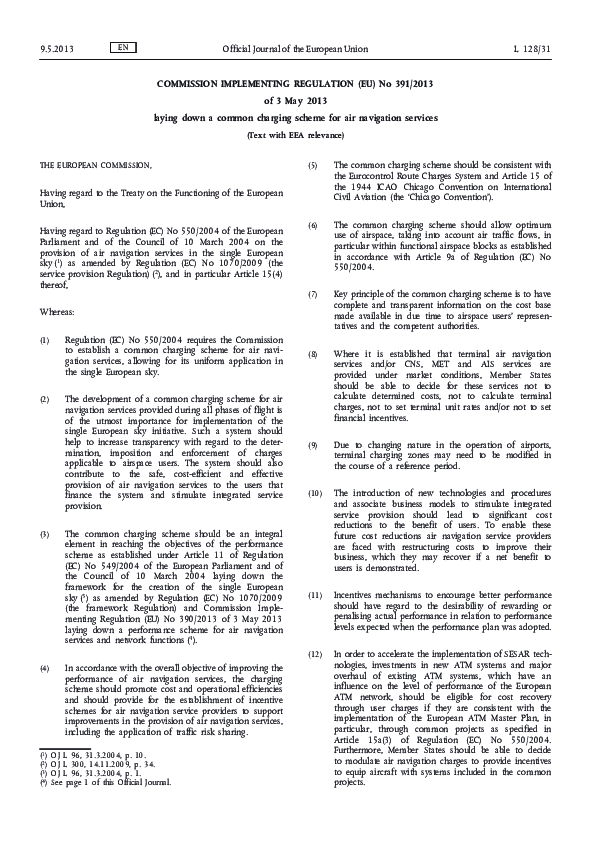 Commission Implementing Regulation (EU) No 391/2013 of 3 May 2013 laying down a common charging sche